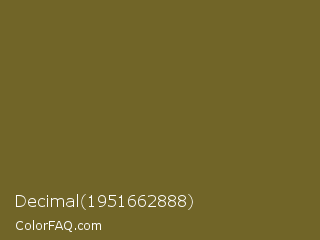 Decimal 1951662888 Color is a dark yellow color and the nearest color is Yellow Metal #716338. Hex code #716528 and RGB value is rgb(113,101,40). In RGB color space, this color is composed of 44% red, 40% green, 16% blue, In CMYK color space, this color is composed of 0% cyan, 11% magenta, 65% yellow , 56% black , In HSL color space, this color has a hue angle of 50° , 48% saturation and 30% lightness.