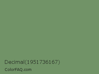 Decimal 1951736167 Color is a normal green color and the nearest color is Highland #6f8e63. Hex code #719367 and RGB value is rgb(113,147,103). In RGB color space, this color is composed of 44% red, 58% green, 40% blue, In CMYK color space, this color is composed of 23% cyan, 0% magenta, 30% yellow , 42% black , In HSL color space, this color has a hue angle of 106° , 18% saturation and 49% lightness.