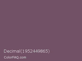 Decimal 1952449865 Color is a normal magenta color and the nearest color is Zambezi #685558. Hex code #725065 and RGB value is rgb(114,80,101). In RGB color space, this color is composed of 45% red, 31% green, 40% blue, In CMYK color space, this color is composed of 0% cyan, 30% magenta, 11% yellow , 55% black , In HSL color space, this color has a hue angle of 323° , 18% saturation and 38% lightness.