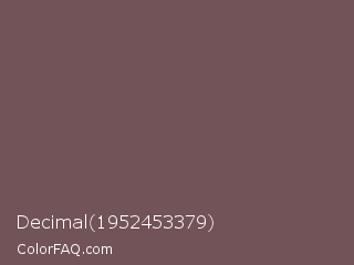 Decimal 1952453379 Color is a normal red color and the nearest color is Russett #755a57. Hex code #725357 and RGB value is rgb(114,83,87). In RGB color space, this color is composed of 45% red, 33% green, 34% blue, In CMYK color space, this color is composed of 0% cyan, 27% magenta, 24% yellow , 55% black , In HSL color space, this color has a hue angle of 352° , 16% saturation and 39% lightness.