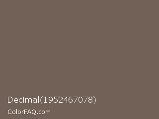 Decimal 1952467078 Color is a normal orange color and the nearest color is Coffee #706555. Hex code #726156 and RGB value is rgb(114,97,86). In RGB color space, this color is composed of 45% red, 38% green, 34% blue, In CMYK color space, this color is composed of 0% cyan, 15% magenta, 25% yellow , 55% black , In HSL color space, this color has a hue angle of 24° , 14% saturation and 39% lightness.