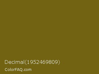 Decimal 1952469809 Color is a dark yellow color and the nearest color is Spicy Mustard #74640d. Hex code #726313 and RGB value is rgb(114,99,19). In RGB color space, this color is composed of 45% red, 39% green, 7% blue, In CMYK color space, this color is composed of 0% cyan, 13% magenta, 83% yellow , 55% black , In HSL color space, this color has a hue angle of 51° , 71% saturation and 26% lightness.