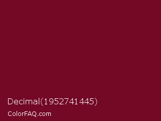 Decimal 1952741445 Color is a dark rose color and the nearest color is Black Rose #67032d. Hex code #730925 and RGB value is rgb(115,9,37). In RGB color space, this color is composed of 45% red, 4% green, 15% blue, In CMYK color space, this color is composed of 0% cyan, 92% magenta, 68% yellow , 55% black , In HSL color space, this color has a hue angle of 344° , 85% saturation and 24% lightness.