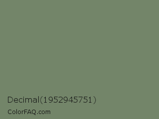Decimal 1952945751 Color is a normal green color and the nearest color is Camouflage Green #78866b. Hex code #738569 and RGB value is rgb(115,133,105). In RGB color space, this color is composed of 45% red, 52% green, 41% blue, In CMYK color space, this color is composed of 14% cyan, 0% magenta, 21% yellow , 48% black , In HSL color space, this color has a hue angle of 99° , 12% saturation and 47% lightness.