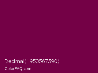 Decimal 1953567590 Color is a dark magenta color and the nearest color is Siren #7a013a. Hex code #740146 and RGB value is rgb(116,1,70). In RGB color space, this color is composed of 45% red, 0% green, 27% blue, In CMYK color space, this color is composed of 0% cyan, 99% magenta, 40% yellow , 55% black , In HSL color space, this color has a hue angle of 324° , 98% saturation and 23% lightness.