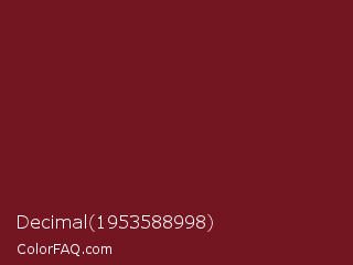 Decimal 1953588998 Color is a dark red color and the nearest color is Persian Plum #701c1c. Hex code #741622 and RGB value is rgb(116,22,34). In RGB color space, this color is composed of 45% red, 9% green, 13% blue, In CMYK color space, this color is composed of 0% cyan, 81% magenta, 71% yellow , 55% black , In HSL color space, this color has a hue angle of 352° , 68% saturation and 27% lightness.
