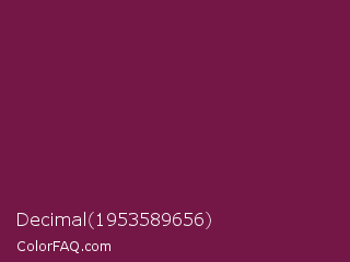 Decimal 1953589656 Color is a dark rose color and the nearest color is Pansy Purple #78184a. Hex code #741746 and RGB value is rgb(116,23,70). In RGB color space, this color is composed of 45% red, 9% green, 27% blue, In CMYK color space, this color is composed of 0% cyan, 80% magenta, 40% yellow , 55% black , In HSL color space, this color has a hue angle of 330° , 67% saturation and 27% lightness.