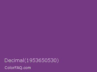 Decimal 1953650530 Color is a normal purple color and the nearest color is Maximum Purple #733380. Hex code #743982 and RGB value is rgb(116,57,130). In RGB color space, this color is composed of 45% red, 22% green, 51% blue, In CMYK color space, this color is composed of 11% cyan, 56% magenta, 0% yellow , 49% black , In HSL color space, this color has a hue angle of 288° , 39% saturation and 37% lightness.