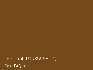 Decimal 1953666897 Color is a dark orange color and the nearest color is Raw Umber #734a12. Hex code #744917 and RGB value is rgb(116,73,23). In RGB color space, this color is composed of 45% red, 29% green, 9% blue, In CMYK color space, this color is composed of 0% cyan, 37% magenta, 80% yellow , 55% black , In HSL color space, this color has a hue angle of 32° , 67% saturation and 27% lightness.