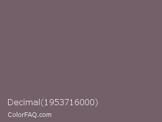 Decimal 1953716000 Color is a normal rose color and the nearest color is Falcon #7f626d. Hex code #746068 and RGB value is rgb(116,96,104). In RGB color space, this color is composed of 45% red, 38% green, 41% blue, In CMYK color space, this color is composed of 0% cyan, 17% magenta, 10% yellow , 55% black , In HSL color space, this color has a hue angle of 336° , 9% saturation and 42% lightness.