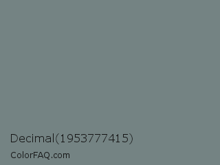 Decimal 1953777415 Color is a normal cyan color and the nearest color is Sirocco #718080. Hex code #748383 and RGB value is rgb(116,131,131). In RGB color space, this color is composed of 45% red, 51% green, 51% blue, In CMYK color space, this color is composed of 11% cyan, 0% magenta, 0% yellow , 49% black , In HSL color space, this color has a hue angle of 180° , 6% saturation and 48% lightness.