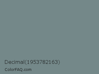 Decimal 1953782163 Color is a normal cyan color and the nearest color is Blue Smoke #748881. Hex code #748889 and RGB value is rgb(116,136,137). In RGB color space, this color is composed of 45% red, 53% green, 54% blue, In CMYK color space, this color is composed of 15% cyan, 1% magenta, 0% yellow , 46% black , In HSL color space, this color has a hue angle of 183° , 8% saturation and 50% lightness.