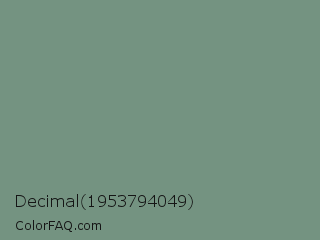 Decimal 1953794049 Color is a normal green color and the nearest color is Laurel #749378. Hex code #749381 and RGB value is rgb(116,147,129). In RGB color space, this color is composed of 45% red, 58% green, 51% blue, In CMYK color space, this color is composed of 21% cyan, 0% magenta, 12% yellow , 42% black , In HSL color space, this color has a hue angle of 145° , 13% saturation and 52% lightness.