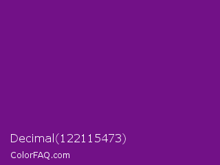 Decimal 122115473 Color is a dark purple color and the nearest color is Seance #731e8f. Hex code #721187 and RGB value is rgb(114,17,135). In RGB color space, this color is composed of 45% red, 7% green, 53% blue, In CMYK color space, this color is composed of 16% cyan, 87% magenta, 0% yellow , 47% black , In HSL color space, this color has a hue angle of 289° , 78% saturation and 30% lightness.