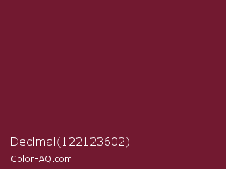 Decimal 122123602 Color is a dark rose color and the nearest color is Claret #7f1734. Hex code #721930 and RGB value is rgb(114,25,48). In RGB color space, this color is composed of 45% red, 10% green, 19% blue, In CMYK color space, this color is composed of 0% cyan, 78% magenta, 58% yellow , 55% black , In HSL color space, this color has a hue angle of 344° , 64% saturation and 27% lightness.