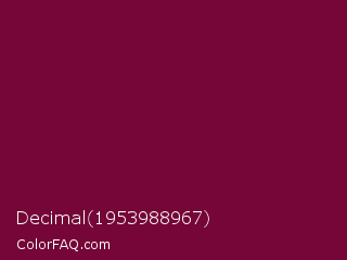 Decimal 1953988967 Color is a dark rose color and the nearest color is Siren #7a013a. Hex code #750637 and RGB value is rgb(117,6,55). In RGB color space, this color is composed of 46% red, 2% green, 22% blue, In CMYK color space, this color is composed of 0% cyan, 95% magenta, 53% yellow , 54% black , In HSL color space, this color has a hue angle of 334° , 90% saturation and 24% lightness.