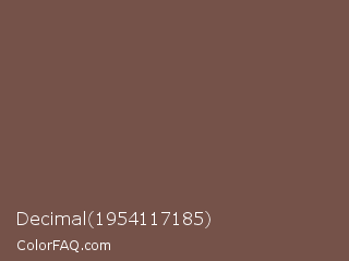 Decimal 1954117185 Color is a normal red color and the nearest color is Ferra #704f50. Hex code #755249 and RGB value is rgb(117,82,73). In RGB color space, this color is composed of 46% red, 32% green, 29% blue, In CMYK color space, this color is composed of 0% cyan, 30% magenta, 38% yellow , 54% black , In HSL color space, this color has a hue angle of 12° , 23% saturation and 37% lightness.