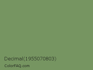 Decimal 1955070803 Color is a normal green color and the nearest color is Highland #6f8e63. Hex code #769561 and RGB value is rgb(118,149,97). In RGB color space, this color is composed of 46% red, 58% green, 38% blue, In CMYK color space, this color is composed of 21% cyan, 0% magenta, 35% yellow , 42% black , In HSL color space, this color has a hue angle of 96° , 21% saturation and 48% lightness.