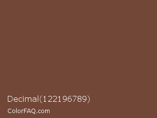 Decimal 122196789 Color is a normal orange color and the nearest color is Tuscan Brown Coffee #6f4e37. Hex code #724737 and RGB value is rgb(114,71,55). In RGB color space, this color is composed of 45% red, 28% green, 22% blue, In CMYK color space, this color is composed of 0% cyan, 38% magenta, 52% yellow , 55% black , In HSL color space, this color has a hue angle of 16° , 35% saturation and 33% lightness.