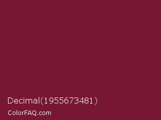 Decimal 1955673481 Color is a dark rose color and the nearest color is Claret #7f1734. Hex code #771735 and RGB value is rgb(119,23,53). In RGB color space, this color is composed of 47% red, 9% green, 21% blue, In CMYK color space, this color is composed of 0% cyan, 81% magenta, 55% yellow , 53% black , In HSL color space, this color has a hue angle of 341° , 68% saturation and 28% lightness.