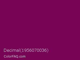 Decimal 1956070036 Color is a dark magenta color and the nearest color is Rose Bud Cherry #800b47. Hex code #780456 and RGB value is rgb(120,4,86). In RGB color space, this color is composed of 47% red, 2% green, 34% blue, In CMYK color space, this color is composed of 0% cyan, 97% magenta, 28% yellow , 53% black , In HSL color space, this color has a hue angle of 318° , 94% saturation and 24% lightness.