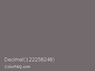 Decimal 122258248 Color is a normal red color and the nearest color is Dove Gray #6d6c6c. Hex code #726a6c and RGB value is rgb(114,106,108). In RGB color space, this color is composed of 45% red, 42% green, 42% blue, In CMYK color space, this color is composed of 0% cyan, 7% magenta, 5% yellow , 55% black , In HSL color space, this color has a hue angle of 345° , 4% saturation and 43% lightness.