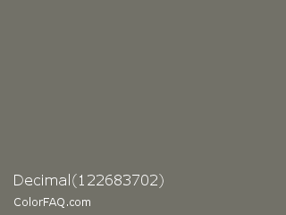 Decimal 122683702 Color is a normal yellow color and the nearest color is Dove Gray #6d6c6c. Hex code #727168 and RGB value is rgb(114,113,104). In RGB color space, this color is composed of 45% red, 44% green, 41% blue, In CMYK color space, this color is composed of 0% cyan, 1% magenta, 9% yellow , 55% black , In HSL color space, this color has a hue angle of 54° , 5% saturation and 43% lightness.