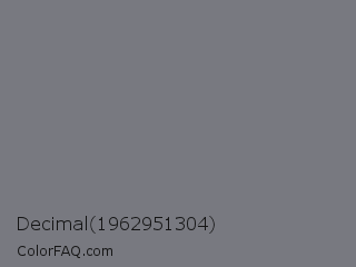 Decimal 1962951304 Color is a normal blue color and the nearest color is Jumbo #7c7b82. Hex code #787980 and RGB value is rgb(120,121,128). In RGB color space, this color is composed of 47% red, 47% green, 50% blue, In CMYK color space, this color is composed of 6% cyan, 5% magenta, 0% yellow , 50% black , In HSL color space, this color has a hue angle of 233° , 3% saturation and 49% lightness.