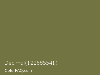 Decimal 122685541 Color is a normal yellow color and the nearest color is Go Ben #726d4e. Hex code #727441 and RGB value is rgb(114,116,65). In RGB color space, this color is composed of 45% red, 45% green, 25% blue, In CMYK color space, this color is composed of 2% cyan, 0% magenta, 44% yellow , 55% black , In HSL color space, this color has a hue angle of 62° , 28% saturation and 35% lightness.