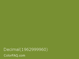 Decimal 1962999960 Color is a normal lime color and the nearest color is Wasabi #788a25. Hex code #789032 and RGB value is rgb(120,144,50). In RGB color space, this color is composed of 47% red, 56% green, 20% blue, In CMYK color space, this color is composed of 17% cyan, 0% magenta, 65% yellow , 44% black , In HSL color space, this color has a hue angle of 75° , 48% saturation and 38% lightness.