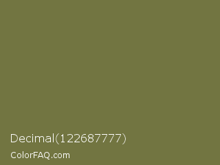 Decimal 122687777 Color is a normal yellow color and the nearest color is Go Ben #726d4e. Hex code #727541 and RGB value is rgb(114,117,65). In RGB color space, this color is composed of 45% red, 46% green, 25% blue, In CMYK color space, this color is composed of 3% cyan, 0% magenta, 44% yellow , 54% black , In HSL color space, this color has a hue angle of 63° , 29% saturation and 36% lightness.