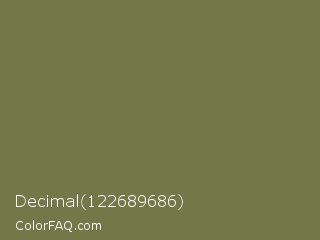 Decimal 122689686 Color is a normal yellow color and the nearest color is Go Ben #726d4e. Hex code #727848 and RGB value is rgb(114,120,72). In RGB color space, this color is composed of 45% red, 47% green, 28% blue, In CMYK color space, this color is composed of 5% cyan, 0% magenta, 40% yellow , 53% black , In HSL color space, this color has a hue angle of 68° , 25% saturation and 38% lightness.