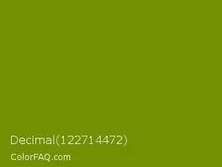 Decimal 122714472 Color is a dark lime color and the nearest color is Limeade #6f9d02. Hex code #729000 and RGB value is rgb(114,144,0). In RGB color space, this color is composed of 45% red, 56% green, 0% blue, In CMYK color space, this color is composed of 21% cyan, 0% magenta, 100% yellow , 44% black , In HSL color space, this color has a hue angle of 73° , 100% saturation and 28% lightness.