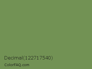 Decimal 122717540 Color is a normal green color and the nearest color is Highland #6f8e63. Hex code #729254 and RGB value is rgb(114,146,84). In RGB color space, this color is composed of 45% red, 57% green, 33% blue, In CMYK color space, this color is composed of 22% cyan, 0% magenta, 42% yellow , 43% black , In HSL color space, this color has a hue angle of 91° , 27% saturation and 45% lightness.