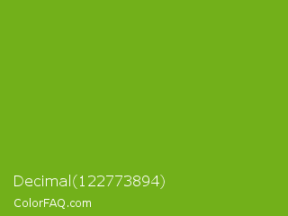 Decimal 122773894 Color is a normal green color and the nearest color is Lima #76bd17. Hex code #72b01a and RGB value is rgb(114,176,26). In RGB color space, this color is composed of 45% red, 69% green, 10% blue, In CMYK color space, this color is composed of 35% cyan, 0% magenta, 85% yellow , 31% black , In HSL color space, this color has a hue angle of 85° , 74% saturation and 40% lightness.