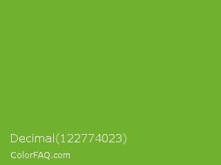 Decimal 122774023 Color is a normal green color and the nearest color is Green RYB #66b032. Hex code #72b02f and RGB value is rgb(114,176,47). In RGB color space, this color is composed of 45% red, 69% green, 18% blue, In CMYK color space, this color is composed of 35% cyan, 0% magenta, 73% yellow , 31% black , In HSL color space, this color has a hue angle of 89° , 58% saturation and 44% lightness.