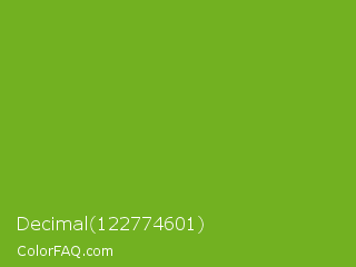 Decimal 122774601 Color is a normal green color and the nearest color is Lima #76bd17. Hex code #72b121 and RGB value is rgb(114,177,33). In RGB color space, this color is composed of 45% red, 69% green, 13% blue, In CMYK color space, this color is composed of 36% cyan, 0% magenta, 81% yellow , 31% black , In HSL color space, this color has a hue angle of 86° , 69% saturation and 41% lightness.