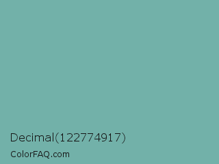 Decimal 122774917 Color is a normal cyan color and the nearest color is Green Sheen #6eaea1. Hex code #72b1a9 and RGB value is rgb(114,177,169). In RGB color space, this color is composed of 45% red, 69% green, 66% blue, In CMYK color space, this color is composed of 36% cyan, 0% magenta, 5% yellow , 31% black , In HSL color space, this color has a hue angle of 172° , 29% saturation and 57% lightness.