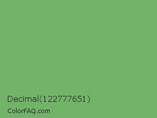 Decimal 122777651 Color is a normal green color and the nearest color is Bud Green #7bb661. Hex code #72b369 and RGB value is rgb(114,179,105). In RGB color space, this color is composed of 45% red, 70% green, 41% blue, In CMYK color space, this color is composed of 36% cyan, 0% magenta, 41% yellow , 30% black , In HSL color space, this color has a hue angle of 113° , 33% saturation and 56% lightness.