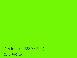Decimal 122897217 Color is a normal green color and the nearest color is Lawn Green #7cfc00. Hex code #72f705 and RGB value is rgb(114,247,5). In RGB color space, this color is composed of 45% red, 97% green, 2% blue, In CMYK color space, this color is composed of 54% cyan, 0% magenta, 98% yellow , 3% black , In HSL color space, this color has a hue angle of 93° , 96% saturation and 49% lightness.