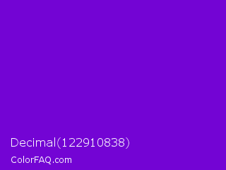 Decimal 122910838 Color is a normal purple color and the nearest color is French Violet #8806ce. Hex code #7304d4 and RGB value is rgb(115,4,212). In RGB color space, this color is composed of 45% red, 2% green, 83% blue, In CMYK color space, this color is composed of 46% cyan, 98% magenta, 0% yellow , 17% black , In HSL color space, this color has a hue angle of 272° , 96% saturation and 42% lightness.