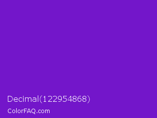 Decimal 122954868 Color is a normal purple color and the nearest color is French Violet #8806ce. Hex code #7316ca and RGB value is rgb(115,22,202). In RGB color space, this color is composed of 45% red, 9% green, 79% blue, In CMYK color space, this color is composed of 43% cyan, 89% magenta, 0% yellow , 21% black , In HSL color space, this color has a hue angle of 271° , 80% saturation and 44% lightness.