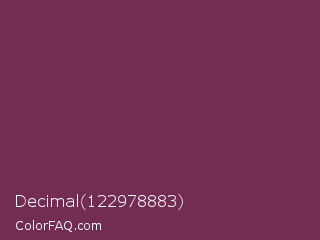 Decimal 122978883 Color is a normal magenta color and the nearest color is Finn #692d54. Hex code #732d53 and RGB value is rgb(115,45,83). In RGB color space, this color is composed of 45% red, 18% green, 33% blue, In CMYK color space, this color is composed of 0% cyan, 61% magenta, 28% yellow , 55% black , In HSL color space, this color has a hue angle of 327° , 44% saturation and 31% lightness.