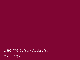 Decimal 1967753219 Color is a dark rose color and the nearest color is Siren #7a013a. Hex code #800533 and RGB value is rgb(128,5,51). In RGB color space, this color is composed of 50% red, 2% green, 20% blue, In CMYK color space, this color is composed of 0% cyan, 96% magenta, 60% yellow , 50% black , In HSL color space, this color has a hue angle of 338° , 92% saturation and 26% lightness.