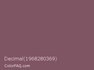 Decimal 1968280369 Color is a normal rose color and the nearest color is Deep Taupe #7e5e60. Hex code #805563 and RGB value is rgb(128,85,99). In RGB color space, this color is composed of 50% red, 33% green, 39% blue, In CMYK color space, this color is composed of 0% cyan, 34% magenta, 23% yellow , 50% black , In HSL color space, this color has a hue angle of 340° , 20% saturation and 42% lightness.