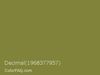 Decimal 1968377957 Color is a normal yellow color and the nearest color is Old Moss Green #867e36. Hex code #808339 and RGB value is rgb(128,131,57). In RGB color space, this color is composed of 50% red, 51% green, 22% blue, In CMYK color space, this color is composed of 2% cyan, 0% magenta, 56% yellow , 49% black , In HSL color space, this color has a hue angle of 62° , 39% saturation and 37% lightness.