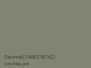 Decimal 1968378742 Color is a normal lime color and the nearest color is Bandicoot #858470. Hex code #808470 and RGB value is rgb(128,132,112). In RGB color space, this color is composed of 50% red, 52% green, 44% blue, In CMYK color space, this color is composed of 3% cyan, 0% magenta, 15% yellow , 48% black , In HSL color space, this color has a hue angle of 72° , 8% saturation and 48% lightness.