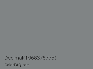 Decimal 1968378775 Color is a normal cyan color and the nearest color is Gunsmoke #828685. Hex code #808485 and RGB value is rgb(128,132,133). In RGB color space, this color is composed of 50% red, 52% green, 52% blue, In CMYK color space, this color is composed of 4% cyan, 1% magenta, 0% yellow , 48% black , In HSL color space, this color has a hue angle of 192° , 2% saturation and 51% lightness.