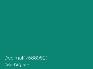Decimal 7688982 Color is a dark cyan color and the nearest color is Elf Green #088370. Hex code #0b8674 and RGB value is rgb(11,134,116). In RGB color space, this color is composed of 4% red, 53% green, 45% blue, In CMYK color space, this color is composed of 92% cyan, 0% magenta, 13% yellow , 47% black , In HSL color space, this color has a hue angle of 171° , 85% saturation and 28% lightness.