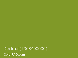 Decimal 1968400000 Color is a normal lime color and the nearest color is Wasabi #788a25. Hex code #809928 and RGB value is rgb(128,153,40). In RGB color space, this color is composed of 50% red, 60% green, 16% blue, In CMYK color space, this color is composed of 16% cyan, 0% magenta, 74% yellow , 40% black , In HSL color space, this color has a hue angle of 73° , 59% saturation and 38% lightness.